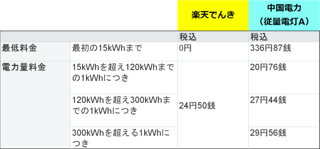 下記の図が「楽天でんき」と「中国電力(従量電灯A)」の基本料金(最低料金)と従量料金の単価です。